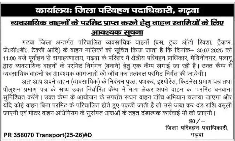गढ़वा। जिला परिवहन कार्यालय में 30 जुलाई, दिन बुधवार को व्यावसायिक वाहनों के परमिट निर्गमन को लेकर एक विशेष कैंप का आयोजन किया जा रहा है। यह कैंप क्षेत्रीय परिवहन प्राधिकारी (RTA), पलामू की अध्यक्षता में आयोजित होगा।