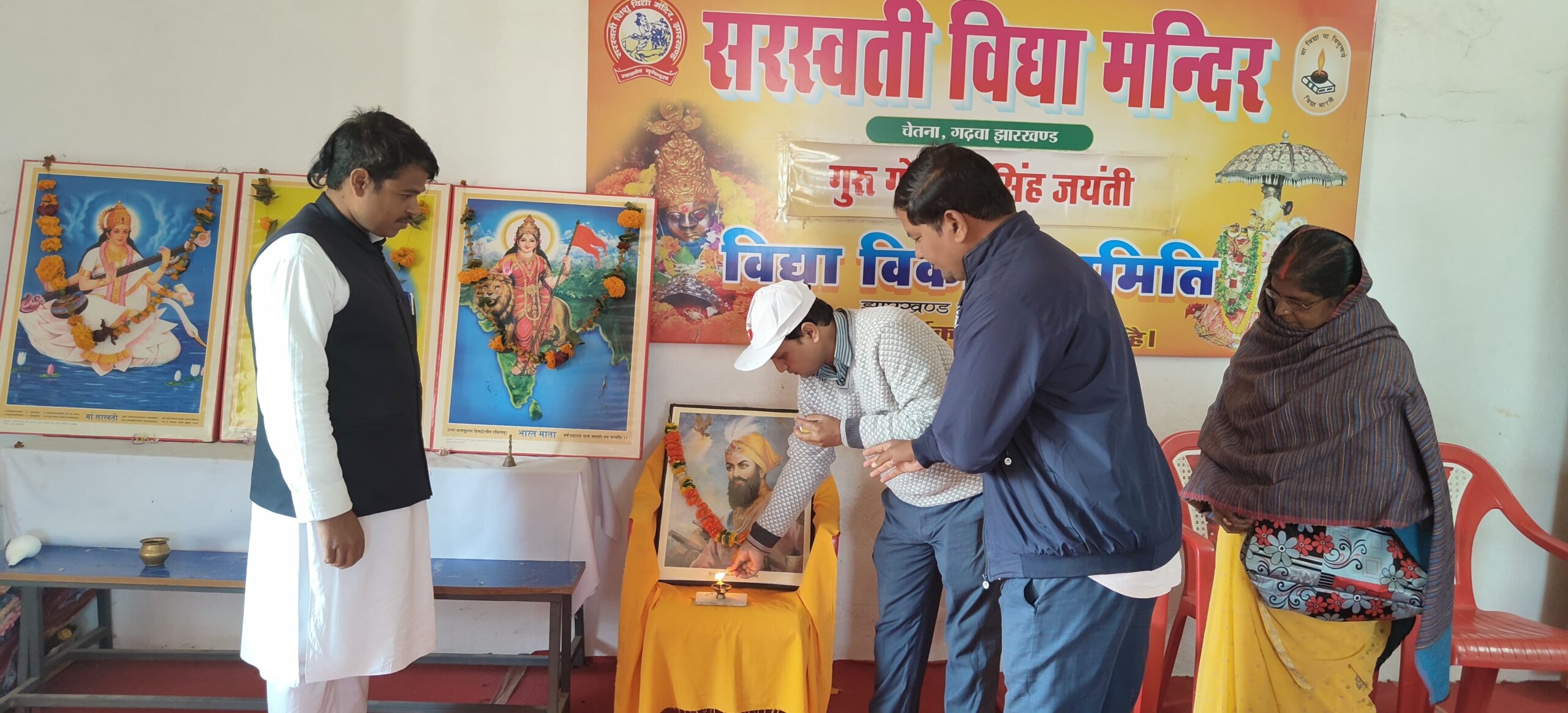 गढ़वा। सरस्वती विद्या मंदिर चेतना, गढ़वा में सिखों के दसवें गुरु गुरु गोविंद सिंह जी की जयंती हर्षोल्लास एवं श्रद्धा के साथ मनाई गई। कार्यक्रम की शुरुआत मुख्य अतिथि डॉ. टी. पीयूष, विकास चौबे एवं विद्यालय के प्रधानाचार्य मनोज कुमार पांडेय द्वारा गुरु गोविंद सिंह जी की तस्वीर पर माल्यार्पण, दीप प्रज्वलन एवं पुष्पांजलि अर्पित कर की गई।